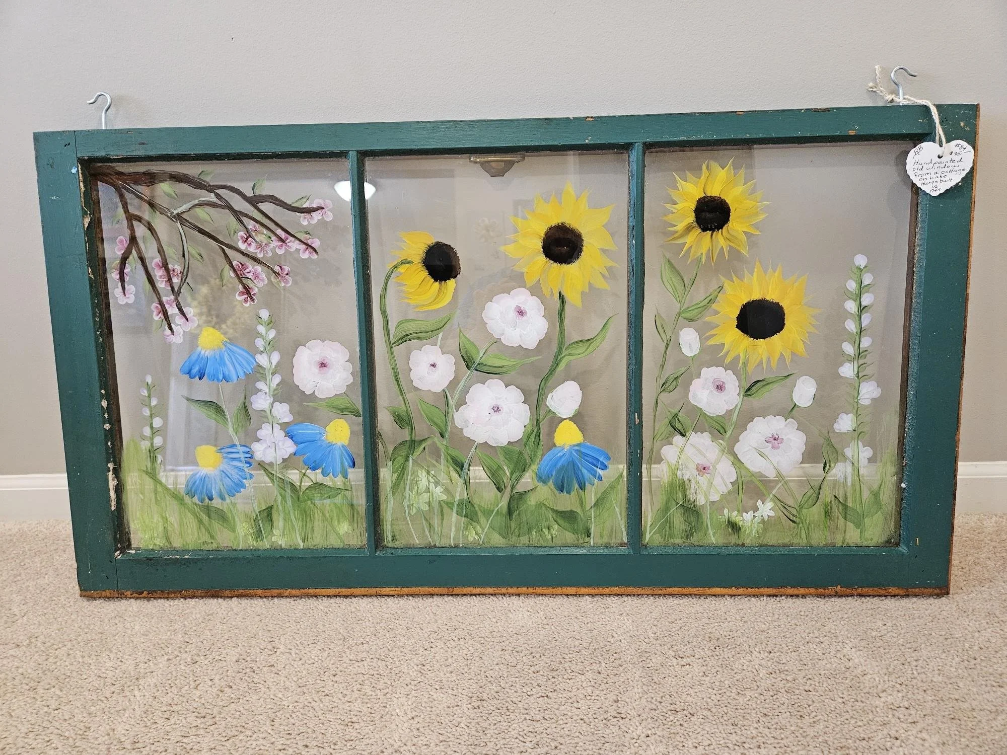 An old window from a cottage built in 1945 on Lake Huron. Called ‘My Grandmother’s Garden’ because it includes many flowers her grandmother grew in her garden at her cottage. 21x40 inches